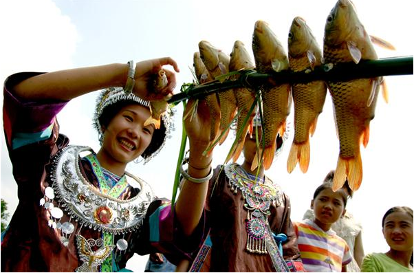 苗家人吃魚的方法有煮、炒、腌酸、晾干等,而最具風味的要數(shù)用火炭燒烤至熟,味道以鮮、美、嫩、香、甜為特色,而且吃法也新穎別致,饒有情趣。