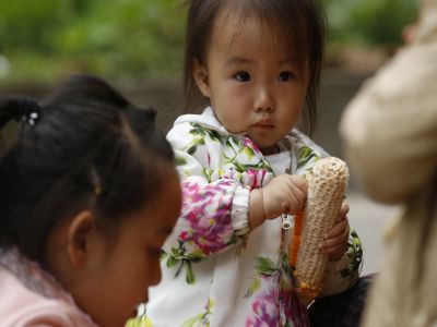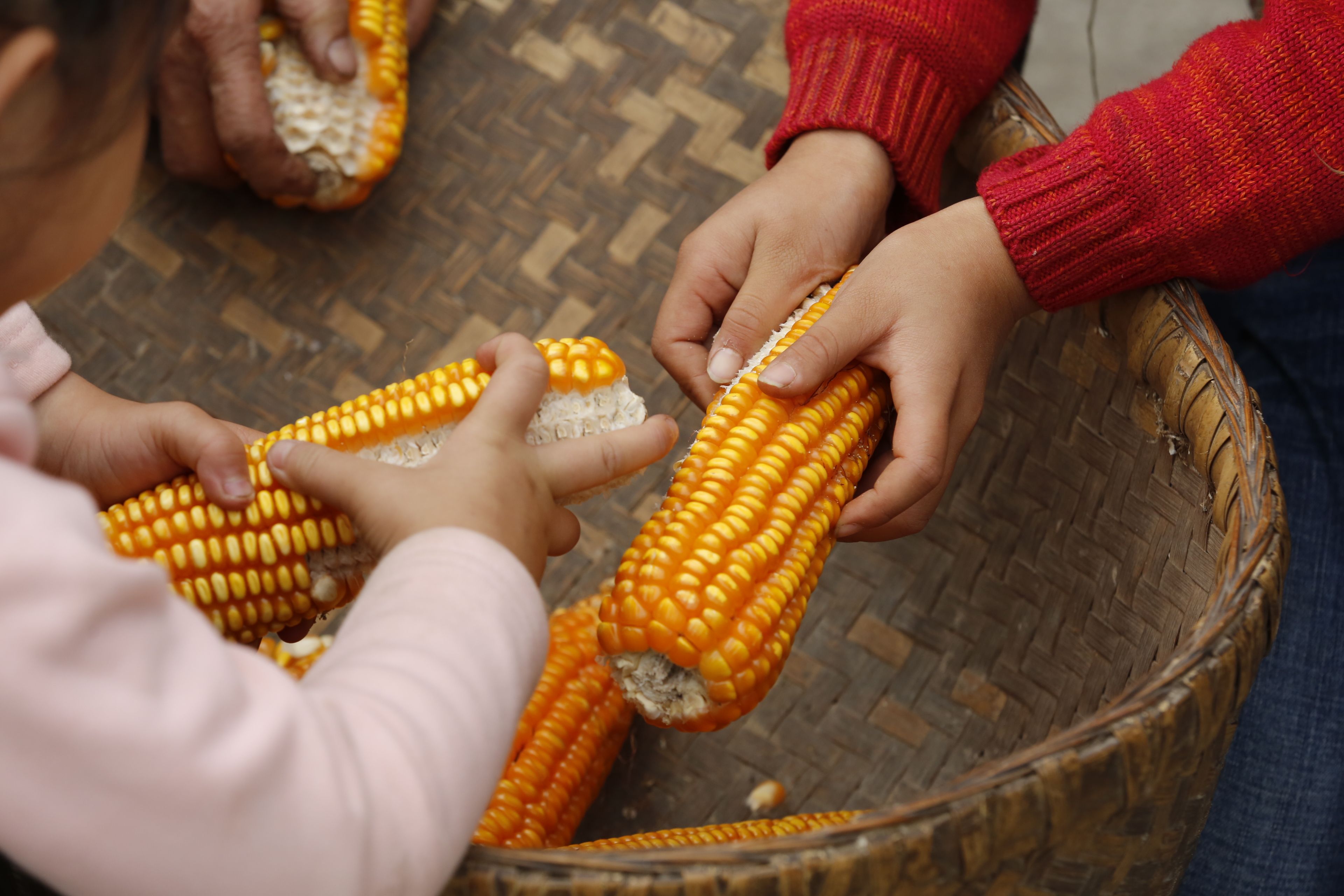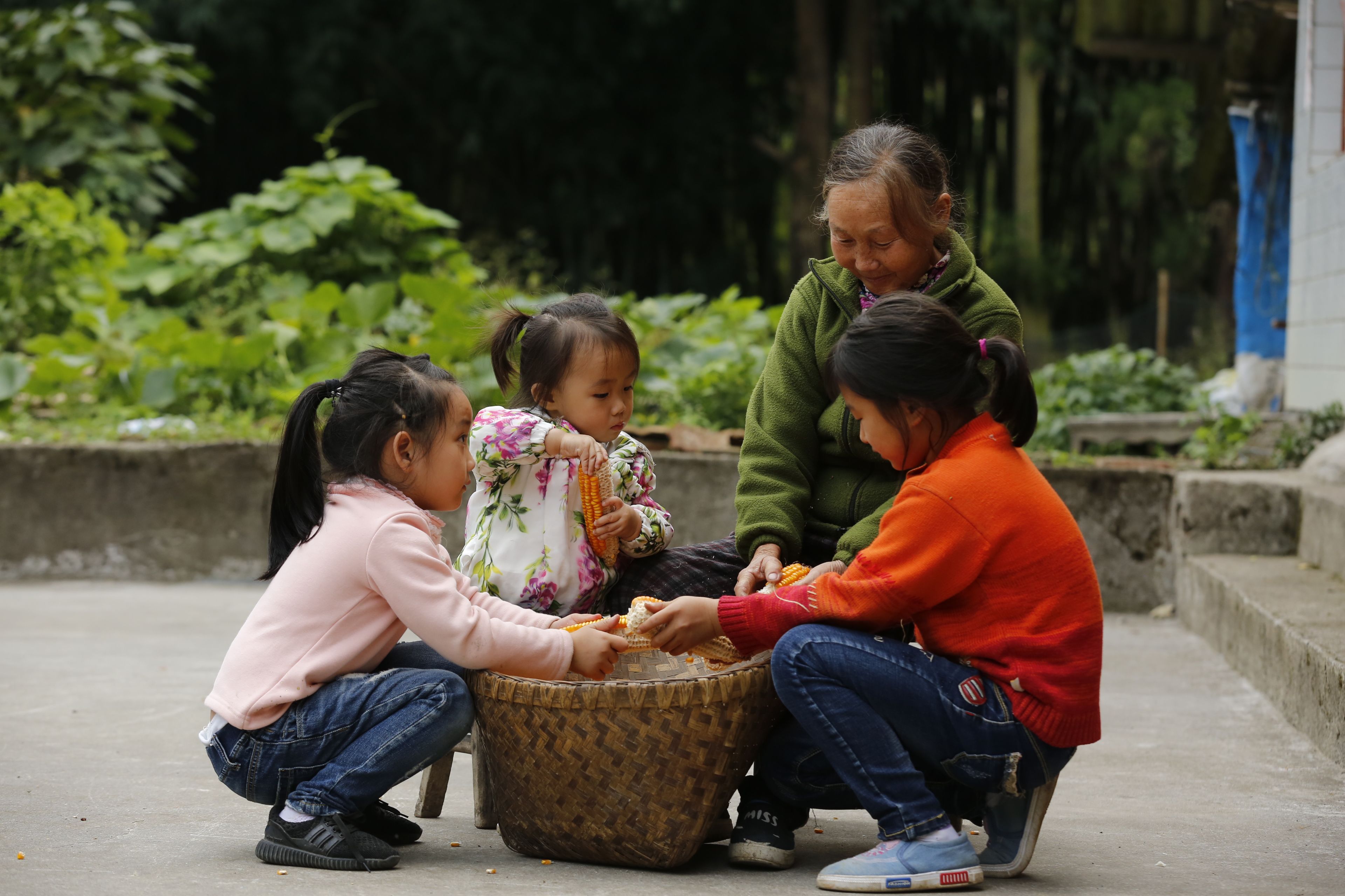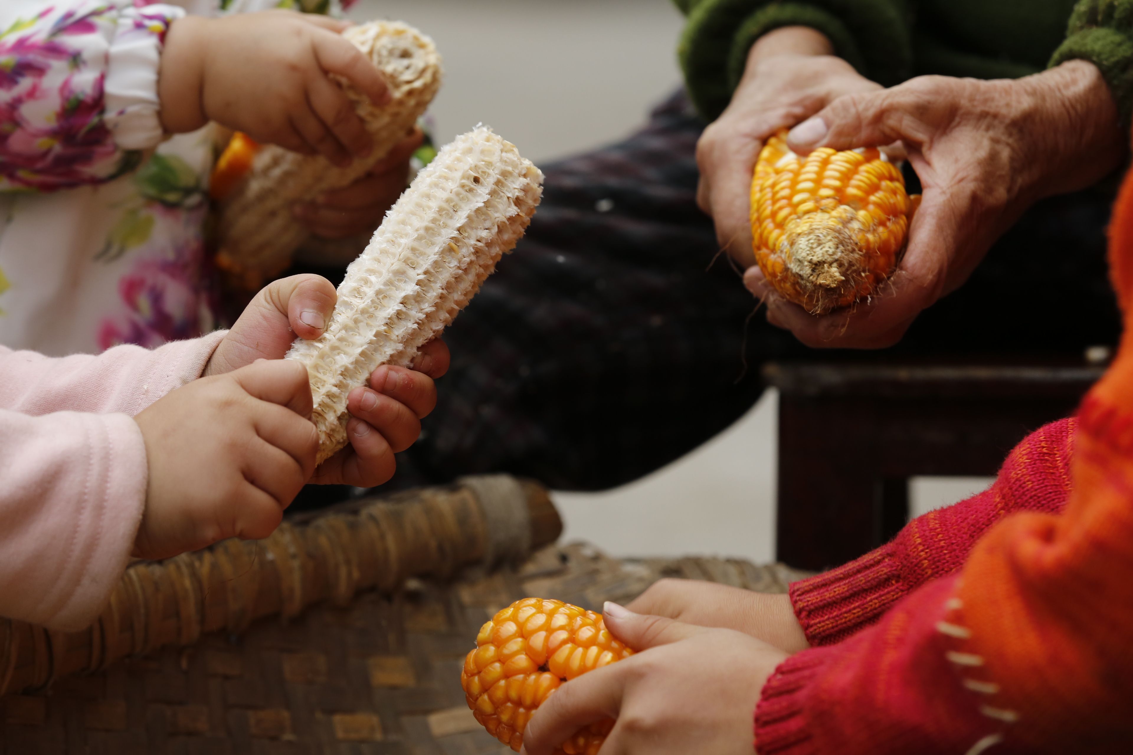 圖片說(shuō)明:貴州貴陽(yáng)苗族老年人與兒童剝玉米